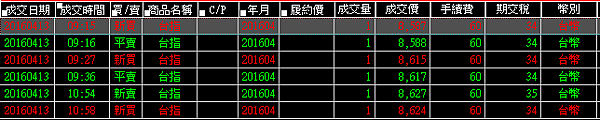 因為設定[移動停損]5點。最高拉到8593,又跌回8588。系統自動停損。