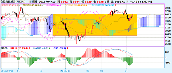 中期一目均衡表,靠近雲箱高點,一目兩線貼合。注意噴出可能。